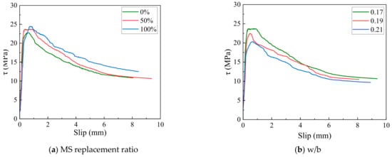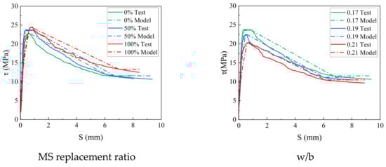 The characteristic parameter values of the bond curve are related to the MS replacement ratio, w/b, and anchoring length. α was taken to be 0.475.