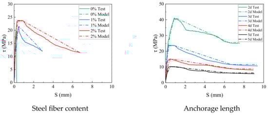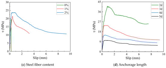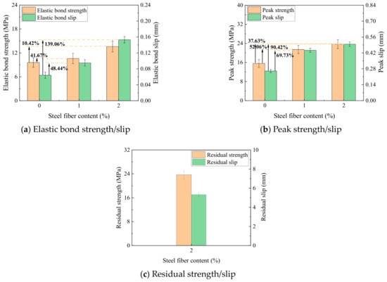 When the steel fiber content increased from 0% to 2%, the average bond strength growth rates were 56.73% and 80.41%, respectively. The bond stress–slip curves’ form is greatly influenced by the amount of steel fiber.