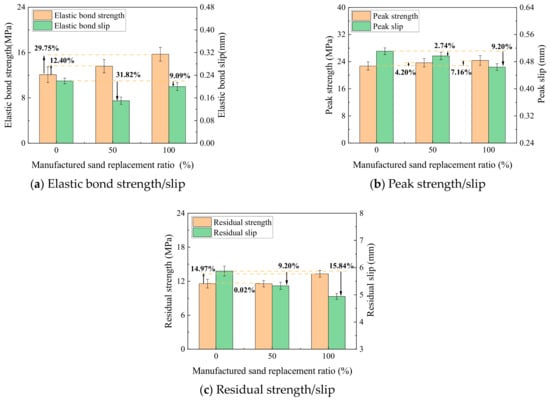 The bond strength increases with an increase in the MS replacement ratio. When the MS replacement ratio increased from 0% to 100%, the average bond strength increased by 2.20%.