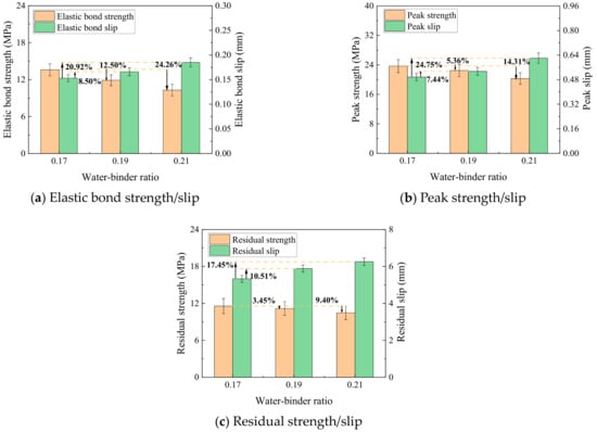 The experimental group with a w/b of 0.17 exhibited a 5.11% increase in the average bond strength compared to the group with a w/b of 0.19 and a 4.62% increase compared to the group with a ratio of 0.21. Between a w/b of 0.17 and 0.21, the peak bond strength reduction was more pronounced, declining by 24.75%.