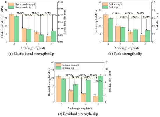 The average bond strength of the specimens with anchorage lengths of 3d, 4d, and 5d decreases by 44.94%, 53.77%, and 74.07% compared to the specimens with an anchorage length of 2d.