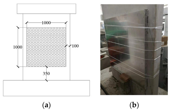 The position of the honeycomb aluminum sandwich layer pasted in the center area of the front of the RC wall is shown in Figure 3a. The curing process after adding a sandwich layer to the RC wall, according to the reinforcement and pasting steps in the Chinese National Standard [26], is shown in Figure 3b. After two weeks of static curing, the HSP- RC walls are subjected to pendulum tests.