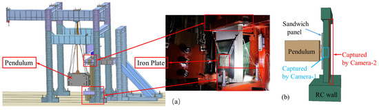 As shown in Figure 4b, two high-speed cameras are used to capture the impact response of the RC wall. Camera-1, positioned two meters from the side, records the mid-span displacement and velocity at 3644 frames per second. Camera-2, located five meters from the back, captures the crack propagation on the wall’s rear at 550 frames per second.