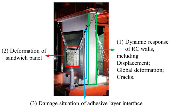 The dynamic behavior and failure of the HSP-RC walls after impact can be divided into three parts. The first one is the deformation and cracking of the protected structure (the RC wall); the second is the deformation and damage of the honeycomb aluminum sandwich panel; and the third is the damage of the adhesive layer connecting the honeycomb sandwich panel and the RC wall. The dynamic response and deformation failure division of the entire HSP-RC wall after the pendulum falls and impacts the specimen are shown in Figure 5.
