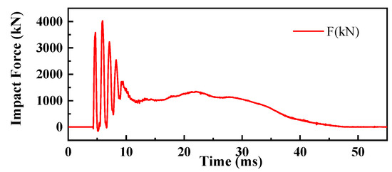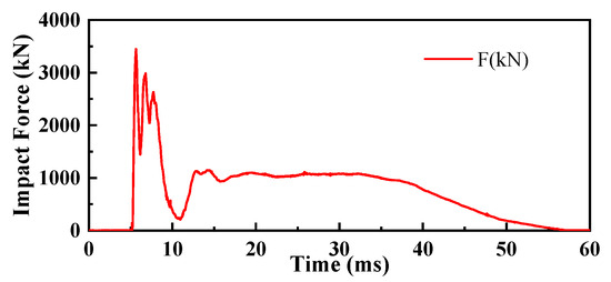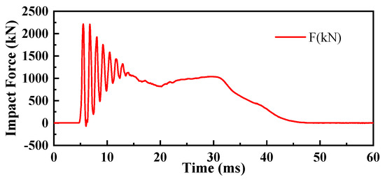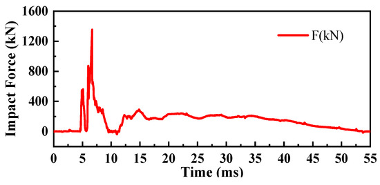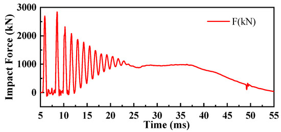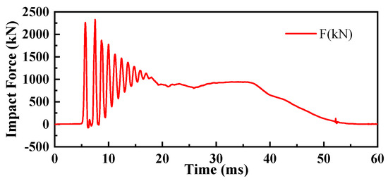 During the complete impact process of a pendulum test, the pendulum will experience rebound after the first impact on the specimen. After the rebound, it will impact again until the energy is exhausted. The impact force–time curves between the hammer head and the specimens of the first impact on the HSP-RC wall’s honeycomb sandwich structure layer and the first impact on the RC wall during the experiment are shown in Figure 6, Figure 7, Figure 8, Figure 9, Figure 10 and Figure 11, respectively.