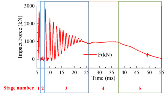 Under the same load and boundary conditions, the HSP-RC walls’ impact force-time curve can be divided into several stages, including the initial peak stage (stage number 1), zero value stage (stage number 2), fluctuation descent stage (stage number 3), plateau stage (stage number 4), and descent stage (stage number 5). Taking HSP-RC Wall-3, which has the most typical impact force variation, as an example, its impact force stages are shown in Figure 12.