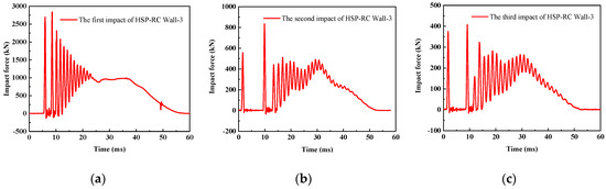 Taking specimen HSP-RC wall-3 as an example, after the pendulum falls, a total of three consecutive impacts occur during the entire pendulum impact process. The impact force–time histories during these three impacts are shown in Figure 13.