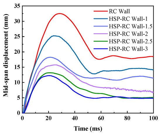 In the pendulum impact tests, the mid-span displacement of the different RC walls during the first impact process was measured, as shown in Figure 14.