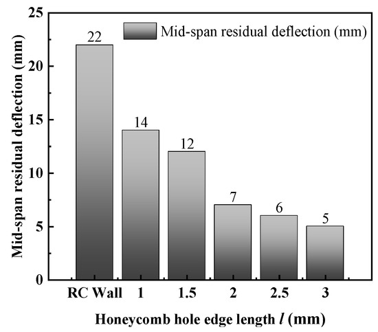 After adding a honeycomb sandwich panel to the surface of the RC wall, the honeycomb sandwich panel layer had varying degrees of protection against the overall deformation of the RC wall under impact. The larger l of the honeycomb hole will cause a lower relative density and stiffness of the honeycomb core. It will provide a stronger protective ability against the mid-span deformation of the RC wall.