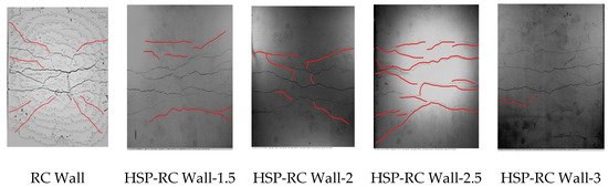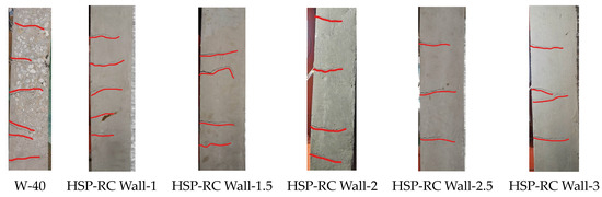 There were no cracks in the area where the wall connects with the upper beam and the lower beam in any of the specimens. There were no complete through cracks on the side of the HSP-RC wall specimens, and the side cracks of all specimens are shown in Figure 16.