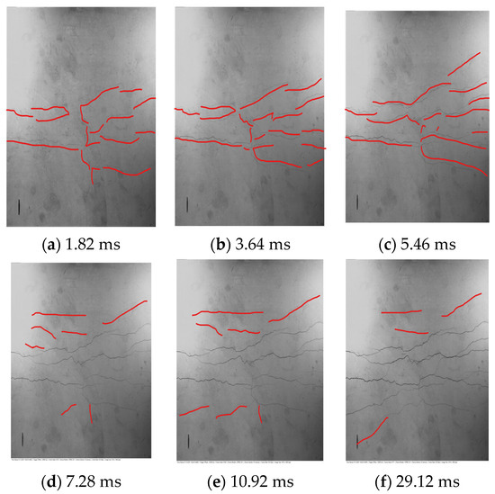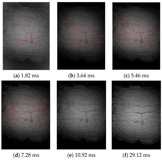 Figure 17 shows that the main transverse cracks on the back of the HSP-RC Wall-1.5 specimen occurred within 7.28 ms, corresponding to the initial peak stage, zero value stage and fluctuation descent stage of the impact force. Differing from the loop failure crack of the RC Wall specimen around the contact area first (shown in Figure 18), the cracks on the back of HSP-RC Wall-1.5 were mainly transverse cracks, and there were no loop-connected cracks in the contact center. There were far fewer micro-expansion cracks than in the RC Wall specimen.