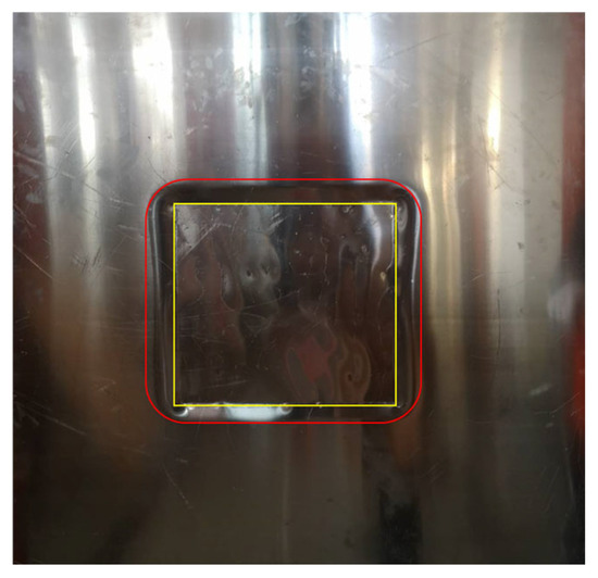 Under the low-speed impact of high energy and mass, the deformation of the honeycomb sandwich panel on the surface of the RC wall mainly occurred on the upper surface. In addition, the deformation of several honeycomb sandwich panels was the same, except that the pit’s depth and the concave area’s external dimensions were different. The bottom surface of the honeycomb sandwich panel was in contact with the constrained RC wall, which can be regarded as being without deformation. Taking the HSP-RC Wall-2.5 as an example, the impact plastic deformation of the upper surface of the honeycomb sandwich panel with an edge length of 2.5 mm is shown in Figure 20. The yellow box in the picture represents the contact area between the iron plate and the honeycomb sandwich panel, which is compressed as a whole and presents a state of overall plane sinking. There is no significant deformation outside the red box. The area between the yellow and red boxes is the transition zone between the iron plate pressing area and the surrounding undeformed area.
