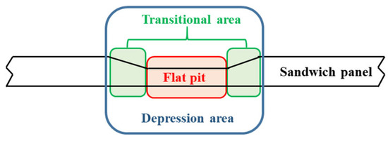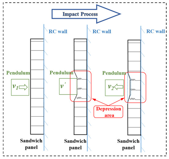 Referring to Dahai’s [27] description of the impact process of the honeycomb sandwich panel in the drop weight test, it can be inferred that the impact deformation process acting on the sandwich panel under the flat indenter impact is as shown in Figure 21. After the iron plate (equivalent to the flat indenter) makes contact with the honeycomb sandwich panel, the direct contact area of the sandwich panel subsides, the rest of the sandwich panel surface does not deform, and the deformation transits in the area around the contact area. After the impact contact, the hammer and iron plate rebound, the upper panel and core of the sandwich layer experience a slight recovery, and the bottom surface remains unchanged, with the RC wall having no local deformation.