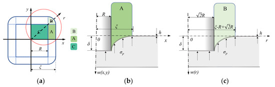 According to reference [28], the pressing process of a sandwich panel under a large mass impact can be considered quasi-static pressing. The ideal impact depression area is illustrated in Figure 23a. Considering the area in the first quadrant (within the circle) as an example, R represents half the width of the iron plate (square indenter head), and δ is the depth of penetration of the square indenter head. The structural models of regions A and C are established along the x-axis, as shown in Figure 23b. Additionally, the structural models of corner regions B and C are established along the diagonal of region C, as shown in Figure 23c.