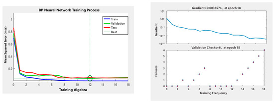 where denotes the original data of the input indicator, denotes the minimum value of these data, and denotes the maximum value of these data. The normalized dataset is brought into MATLAB software (R2018a) for the training of the neural network model, and the specific training process is shown in Figure 2.