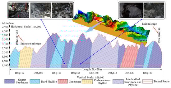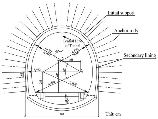 The Chengdu–Lanzhou Railway starts from Chengdu, passing through Maoxian, Songpan, and Jiuzhaigou counties, and ultimately reaches Lanzhou. The entire route ascends from the Chengdu Plain at an altitude of 500 m to the eastern edge of the Qinghai–Tibet Plateau at an altitude of 3400 m. Ping’an Tunnel is the most crucial control project of the Chengdu–Lanzhou Railway. It is located between Taohuazhaigou and Taipinggou in Maoxian, Aba Tibetan and Qiang Autonomous Prefecture, Sichuan Province. The tunnel is 28,428 m long, with a vertical elevation difference of 2900 m from start to finish. The Ping’an Tunnel site has developed geological structures, and the geological conditions are extremely complex. The longitudinal geological section of the tunnel is shown in Figure 1. The tectonic stress in the tunnel site is relatively high, and the surrounding rock of the tunnel has good integrity and high strength, making it prone to stress concentration. Influenced by intense and complex tectonic movements, high ground stress, and excavation disturbances, encountering high-intensity rockbursts during the excavation process in deeply buried hard rock sections poses a serious threat and challenge to tunnel construction and personnel safety. The construction of the tunnel is organized according to the principles of the New Austrian Method, using smooth blasting and anchor-spray initial support with wet spray technology. The tunnel excavation section and design dimensions are shown in Figure 2. The on-site support parameters and construction process for the Ping’an Tunnel are as follows: First, 3.0 m long Φ25 mm system bolts are installed into the surrounding rock at 1.0 × 1.0 m intervals. Next, I16 steel arches are erected. Finally, C25 concrete is sprayed to a thickness of 8.0 cm. Once the initial support is complete and the surrounding rock is stabilized, a 1.0 m thick layer of C30 reinforced concrete is applied as the secondary lining of the tunnel.
