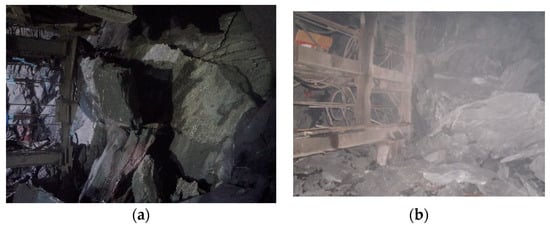 The damage caused by rockburst on the right line of Ping’an Tunnel was more serious than that on the left line. The projectile rock mass in the strong rockburst section of the right line reached 50 m3 with the projectile distance up to 30 m. The strong rockburst caused damage to the initial support structure of the right line. The arch was seriously distorted and severely collapsed locally. A middle rock pillar was formed 50 m before the right line penetrated. Due to stress concentration and energy accumulation, a strong rockburst occurred, as shown in Figure 4.