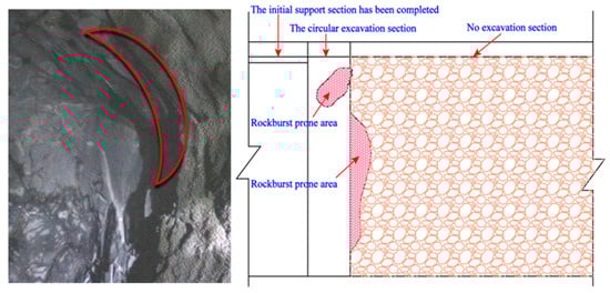 On-site and schematic diagram of vulnerable rockburst location at boundary of broken surrounding rock.