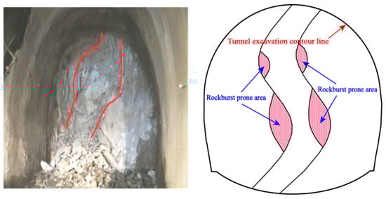 From the perspective of the occurrence time, 80% of rockburst in Ping’an Tunnel occurred within 3 h after tunnel excavation, which was the immediate type of rockburst. However, the rockburst could still be heard within 1 to 2 months after the completion of the tunnel support, indicating that there also existed the time-lag-type rockburst in some sections of Ping’an Tunnel. From the perspective of the geological conditions of rockburst, they were all sections of hard surrounding rock under high geo-stress. For sections with hard structural surfaces, even sporadic hard structural surfaces can induce high-intensity rockburst. It was discovered through on-site investigations. The hard structural surface plays a crucial role in controlling the boundary of the blast crater. From the point of view of the occurrence location, when there was no obvious crack, the rockburst was likely to occur on both sides of the excavation section to be circulated and the excavation support section of the face. When the surrounding rock of the face was the irregularly inverted “U” or “S” type, rockbursts were likely to occur in curved depressions. When one side of the surrounding rock was relatively broken while the other side of the surrounding rock was integrally complete, it was easy to produce rockburst at the crossline position, as shown in Figure 5, Figure 6 and Figure 7.