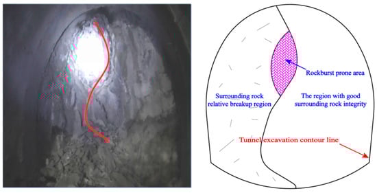 On-site and schematic diagram of vulnerable rockburst location in intact surrounding rock.