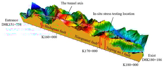 During the construction period, the in situ stress was tested by the stress-releasing method. The measuring point was located at D8K171+760 downstream of the right line. This is shown in Figure 8.