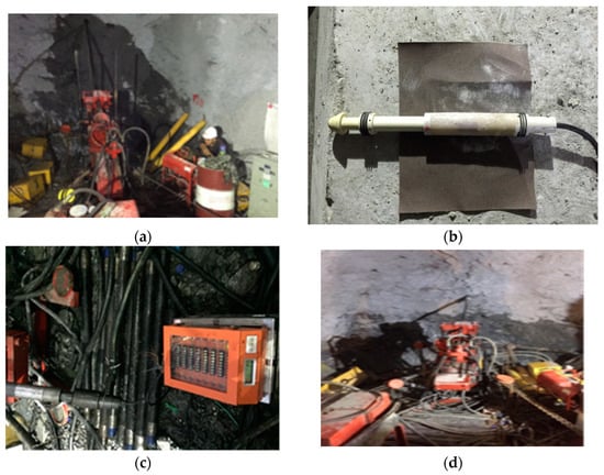 The surrounding rock in this section was mainly hard and intact sandstone without obvious cracks. To accurately obtain the in situ stress and avoid the mutual influence of tunnel construction and in situ stress testing, a 4 m × 4 m × 3 m chamber was excavated at D8K171+760 as a test site. The hole was drilled on the inner wall of the chamber, as shown in Figure 9. To measure the stress, a 130 mm diameter stress test hole was drilled. When it reached a certain depth, a 36 mm diameter measurement hole with a depth of about 36 mm was drilled in the center of the large hole. And then the measuring probe was installed in the measurement hole. The probe head related to the measuring instrument outside the hole, and the initial value was measured. After that, a 130 mm drill bit was used to drill concentrically to excavate the stress-releasing groove. During the drilling process, the wire passed through the center of the drill pipe and was led out at the joint head to connect with the measuring instrument. The changes during the releasing process were monitored. With the deepening of the releasing groove, the core was gradually isolated from the external stress field, and the core elastically recovered. Simultaneously, the measured value of the instrument changed. The drilling did not stop until the instrument reading no longer changed. Finally, the core was taken out. The test results are shown in Table 2.