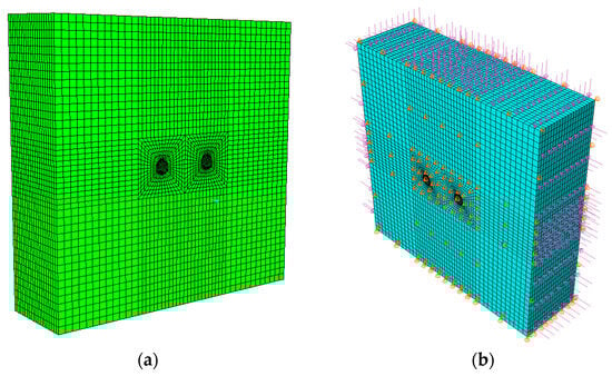Based on D8K171+760 of Ping’an Tunnel, a related model was established. Considering the boundary effect, the two sides and upper and lower positions of the tunnel in the model were set to be five times the tunnel diameter from the model boundary. The three-dimensional calculation model size was 200 × 60 × 200 m. The surrounding rock was simulated by hexahedral elements, and the numerical calculation model was divided into 74,620 elements, as shown in Figure 10a []. According to the in situ stress obtained by the test, the boundary conditions of the model were applied. It is worth noting that because the buried depth of the excavation section at the simulated location reached 1250 m, to truly reflect the buried depth, a top load of about 30 MPa was applied to the top of the model. For the boundary conditions of the model, to consider the influence of tectonic stress on tunnel excavation, lateral pressure was applied on the boundary surface of the model in the x direction. The translational degrees of freedom in the y and z directions of the model were, respectively, constrained in corresponding directions, as shown in Figure 10b. The material properties of the surrounding rock were considered as the ideal elastoplastic behavior of the Mohr–Coulomb yield criterion.
