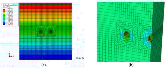 Based on the geological survey data of the Ping’an Tunnel and considering the complexity of in situ stress, repeated tests were conducted on the model to accurately reflect the in situ stress in the rockburst section of the Ping’an Tunnel. The boundary conditions and applied loads were adjusted and corrected as follows: First, based on the in situ stress test results in Table 2 of Section 4.1, the load values applied to the top and sides of the model were determined. Then, by adjusting the load values applied to the top and sides of the numerical model, the in situ stress in the surrounding rock was made to match the measured in situ stress. Finally, the initial stress field suitable for the tunnel site was established, as shown in Figure 11a.