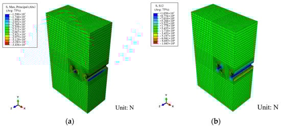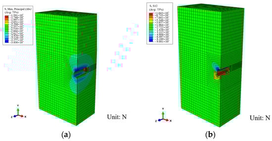 Stress contour of left tunnel: (a) Results of maximum principal stress. (b) Results of shear stress.