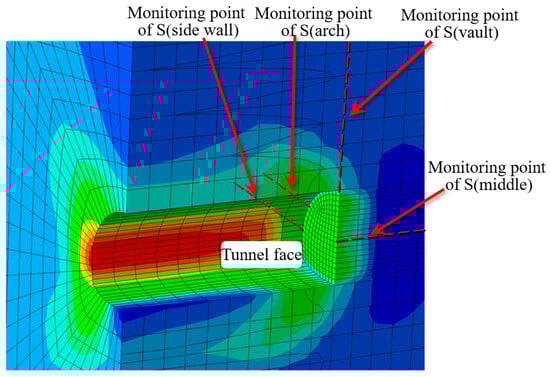 It can be seen from Figure 12 that during the excavation process, the full tunnel section is compressed, and the maximum principal stress appears at the side wall. The shear stress is mainly distributed at the side wall and the arch waist. To study the stress distribution of the rockburst section of the tunnel during the excavation process, monitoring points were set in the model result file to track the stress parameters in the model, to obtain the change path of different stresses in the model calculation process, which is useful for analyzing the stress at different locations of the tunnel during the excavation process. Therefore, in this calculation, monitoring points were arranged in various locations of the tunnel to study the stress changes and the final stress state of different locations during the excavation process. After solving the model, we arranged monitoring points in each part of the tunnel to study the stress changes in different parts and the final stress state during excavation. This is shown in Figure 13.