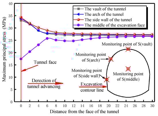 To analyze the stress changes at different locations of the tunnel during the tunnel excavation process, the maximum principal stress change curve of each monitoring location of the left tunnel of the tunnel during the excavation process is drawn, as shown in Figure 14.