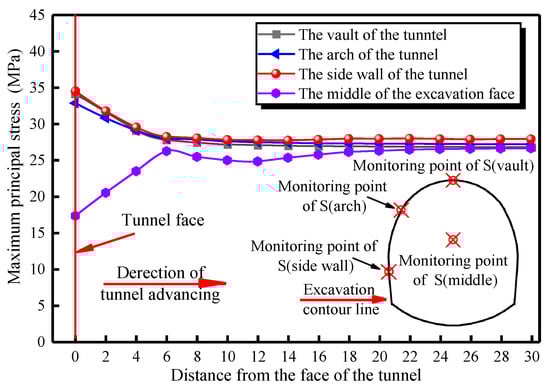 It can be seen from Figure 14 that the relationship of stress at each location is S (side wall) > S (arch) >S (vault) > S (middle). The principal stresses of the vault, arch waist, and side wall positions decrease with the increase in distance from the excavation face. The maximum principal stress values are all at the tunnel face, and their values are 32.63 MPa for the vault and 32.76 MPa for the arch waist. The maximum principal stress on the side wall is the largest with the value of 34.89 MPa, indicating that the rockburst is likely to occur at the side wall during the excavation process. The side wall is under greater compressive stress, which is the main cause of rockburst. Corresponding measures should be taken to prevent and control rockburst during the tunnel construction process. The principal stress in the middle of the tunnel face is the smallest at the excavation face, with the minimum value of 17.34 MPa.