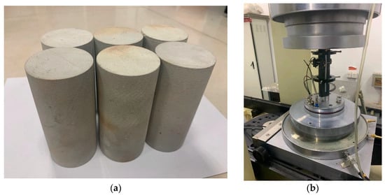 Uniaxial compression tests: (a) Rock specimen of uniaxial compression test. (b) Uniaxial compression test instrument.