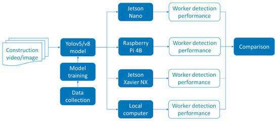 This study entailed training widely used object detection models for testing purposes. Subsequently, these models were deployed onto three edge computing devices to execute construction object detection tasks based on computer vision (CV). Finally, the proposed method’s performance was compared on local computers and edge computing devices. Figure 1 illustrates the framework of this study.
