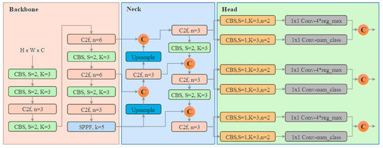 As shown in Figure 2, the network architecture of the YOLOv5 model has three main components: backbone, neck, and head. To perform the object detection task, the image will initially be put into the backbone to extract the features. Accordingly, the features will be fed into the neck. Then, the YOLO layer will generate feature maps, based on which the detection results will be generated. The structure of the Yolov8 network consists of three components: the head, the neck, and the backbone. As shown in Figure 3, the backbone is built on a 53-layer deep convolutional network to extract features from images efficiently. Then, the neck component connects the backbone to the head component to reduce the size of the features and enable efficient processing. The head component consists of multiple convolutional layers for predicting the objects’ class and location in images. This architecture enables Yolov8 to dynamically adjust its focus on various image components based on their relative importance, enabling the detection of both large and small objects in an image by performing object detection at different scales.