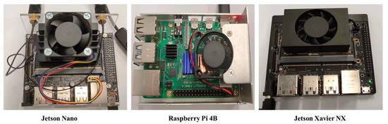 This study selected several edge computing devices for testing: Raspberry Pi 4B (Raspberry Pi, London, UK), Jetson Nano (NAVIDIA, City of Santa Clara, CAL, US), and Jetson Xavier NX (NAVIDIA, City of Santa Clara, CAL, US). Specifically, Raspberry Pi 4B was chosen for its low cost and small size. Jetson Nano and Jetson Xavier were selected since they are widely used edge computing devices with excellent performance. Jetson Xavier outperforms Jetson Nano in computational performance but at a much higher price point. The detailed specifications of the devices are shown in Table 1. NVIDIA Jetson Nano is a powerful small-sized computing device that allows developers to build practical artificial intelligence (AI) applications. It has a quad-core ARM Cortex-A57 MPCore CPU, a 128-core NVIDIA Maxwell GPU, 4 GB memory, and 32 GB data storage. The size of Jetson Nano is 69.6 mm × 45 mm. Raspberry Pi 4B is the latest Raspberry Pi board, which can compute like a local computer with a much smaller size. The size of Raspberry Pi 4B is 85 mm × 56 mm, and it has a 1.8 GHZ 64-bit quad-core ARM Cortex-A72 CPU without the GPU equipped. Jetson Xavier NX has a powerful CPU and GPU, bringing computing performance close to a local computer. It has a 384-core NVIDIA Volta architecture GPU with 48 Tensor Cores GPU and a 6-core NVIDIA Carmel ARM v8.2 64-bit CPU with 128 G storage and 8 GB memory. Typically, the size of the Jetson Xavier NX is also 69.6 mm × 45 mm. Images of the proposed edge computing devices are shown in Figure 4.