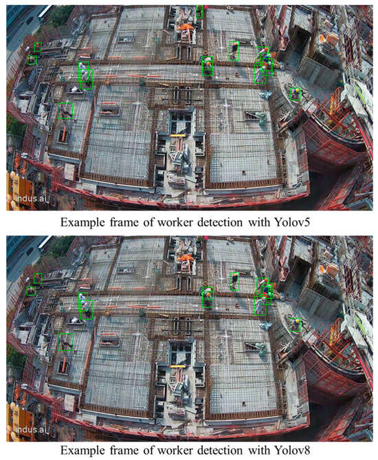 The model was trained on a local computer equipped with an NVIDIA GTX 1660 graphics card (NAVIDIA, City of Santa Clara, CA, USA) and an Intel Core i5-9300H CPU (Intel, City of Santa Clara, CA, USA). The price of the local computer was 13,000 HK$. The proposed method was implemented on the Ubuntu 64 system using Python programming. The Yolov5 and Yolov8 models were trained on a dataset with 5000 images. Specifically, the dataset’s images were recorded from real construction sites in Hong Kong. Images in the dataset were labeled manually with the LabelImg object detection annotation tool. In the training stage, the dataset was divided into a training set and a test set, with 4000 images and 1000 images, respectively. Specifically, the Yolov5 model was operated under a PyTorch environment. The CUDA toolkit 11.6 and cuDNN 8.3.2 were utilized to accelerate model training. The training configuration of Yolov5 was 16 for the batch size, 100 for the number of training iterations, and 0.01 for the learning rate. The training time was 4.16 h. Figure 5b,c show the precision and recall curves, respectively. Figure 5a shows that the mAP value is 0.852, equal to the area under the curve. The training configuration of Yolov8 is 16 for the batch size, 100 for the number of training iterations, and 0.01 for the learning rate. It took 1.11 h to train the model. The mAP value is 0.824. The comparison results of mAP, precision, and recall values of the detection models are indicated in Table 2. Table 3 shows examples of test results.