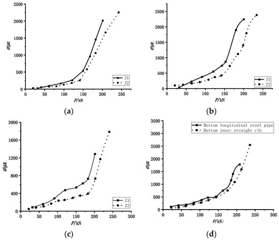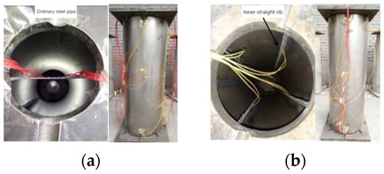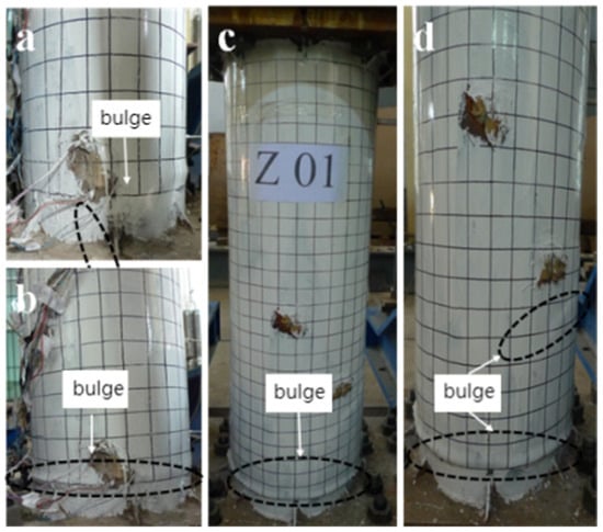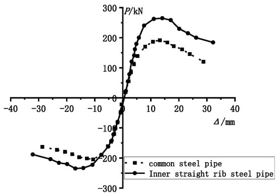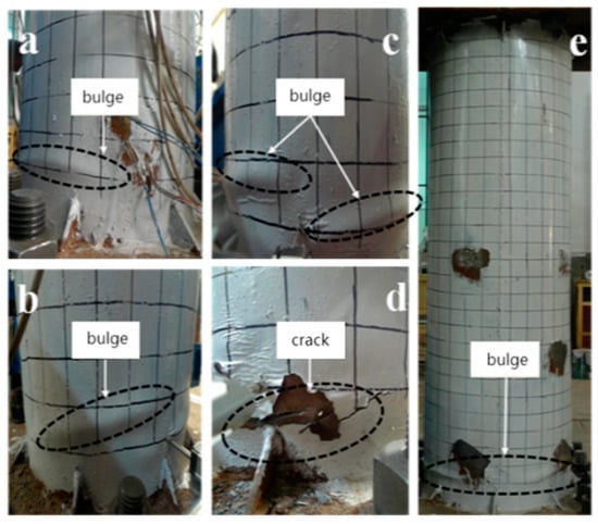- Destruction mode: When subjected to horizontal loads, ordinary and straight-ribbed thin-walled concrete-filled steel-tube columns exhibit similar failure modes, characterized by annular bulging along the bottom of the column. However, the stiffening ribs interrupt the bulging in the latter case. The main failure mode for both is bending failure.