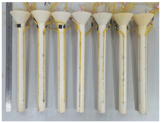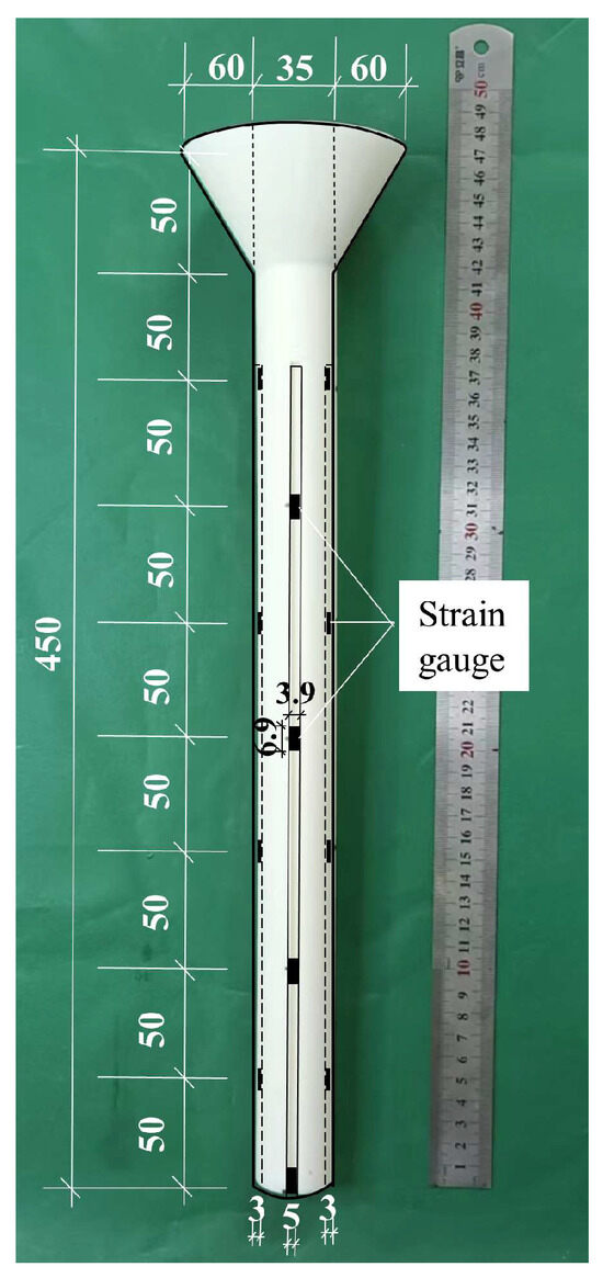 Pile top displacement is measured using displacement transducers, and a miniature soil pressure box is installed at the pile base to measure the pile end load. Strain gauges are attached to multiple sections of the pile body to measure axial forces, and the arrangement of strain gauges on the model pile is shown in Figure 4.