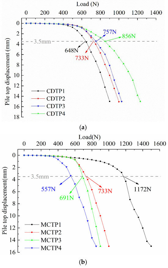 In this model test, the ultimate bearing capacity of the piles is taken as the load value when the pile top displacement reaches 10% of the pile diameter [21]. The experimental results are presented in Table 2.