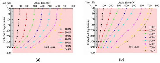 From Figure 8, it can be observed that the axial force of the pile progressively increases with the increase in downward load and gradually decreases with the increase in embedded depth. During the initial loading stage, the axial force at the bottom of the pile is approximately zero, indicating that the upper load is mainly borne by the side resistance of the pile. As the downward load increases, the pile end resistance gradually comes into play, while the side resistance tends to stabilize.