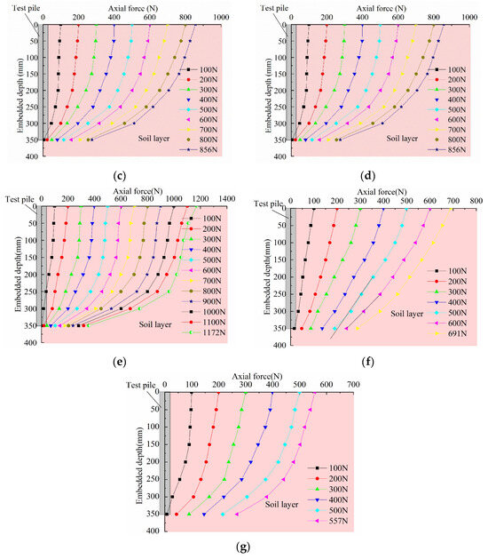 Axial forces distribution along model piles. (a) CDTP1; (b) CDTP2/MCTP2; (c) CDTP3; (d) CDTP4; (e) MCTP1; (f) MCTP3; (g) MCTP4.