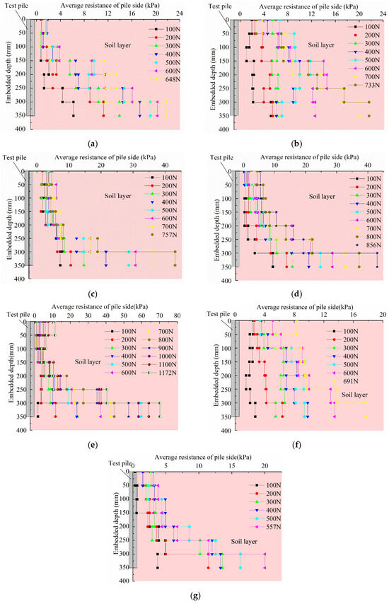 Side resistance distribution of model piles. (a) CDTP1; (b) CDTP2/MCTP2; (c) CDTP3; (d) CDTP4; (e) MCTP1; (f) MCTP3; (g) MCTP4.