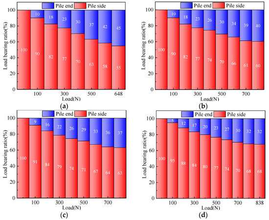 The ratios of load borne by the pile side and pile end relative to the pile head load under various load levels for the seven model piles are analyzed. Taking CDTP1 as an example, under a load of 100 N, the load transferred from the pile top to the pile end is 90 N. Therefore, the pile end bearing ratio is 90%, and the pile side bearing ratio is 10%. The curves of the load ratio at the pile side and pile end are plotted, as shown in Figure 10.