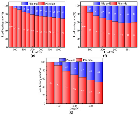 Load ratio curve of the pile side and pile end. (a) CDTP1; (b) CDTP2/MCTP2; (c) CDTP3; (d) CDTP4; (e) MCTP1; (f) MCTP3; (g) MCTP4.