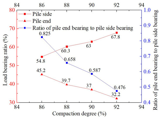 Load bearing by pile end and pile side under different compaction degrees.