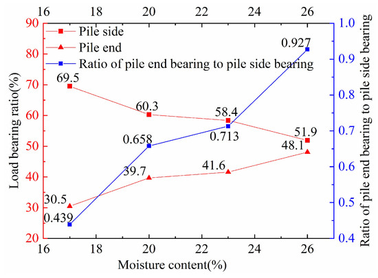 From Table 4 and Figure 12, it is observed that as the moisture content increases from 17% to 26%, the ratio of pile side load gradually decreases from 69.5% to 51.9%%, with an average decrease rate of 4.59%; the ratio of pile end load increases from 30.5% to 41.8%, with an average growth rate of 8.42%. The ratio of the pile end bearing to the pile side bearing increases progressively from 0.439 to 0.927.
