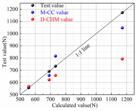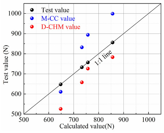 It can be seen from Table 6 and Figure 14 that the error between the test value and the M-CC value is from −10.6% to 11.4%, and the average error is −0.8%. The error between the test value and the D-CHM value is from −1.9% to 32.4%, and the average error is 12.7%.