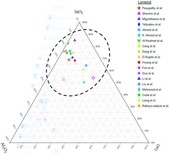 | Pasupathy et al. [3,43] | Waste brick, Australia | Oven-dried at 105 °C for 24 h and then grinding | 20.5 µm | + | + | + | + | - | 7 and 28 days | - | Heat curing (60 °C) for 24 h | FA, GGBFS |