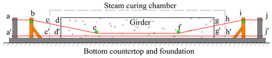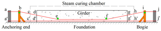 The arrangement of tendons and typical fabrication of pretensioned PC girders is shown in Figure 1. The prestressing tendons (red lines) are passed through the girder. Deviators (green circles) control the path of bent tendons. The tendons are anchored on the rigid frame at the two ends (a, a′, j, j′), and the rigid frames are anchored to the foundation. There is no longitudinal deformation for the two ends of tendons.